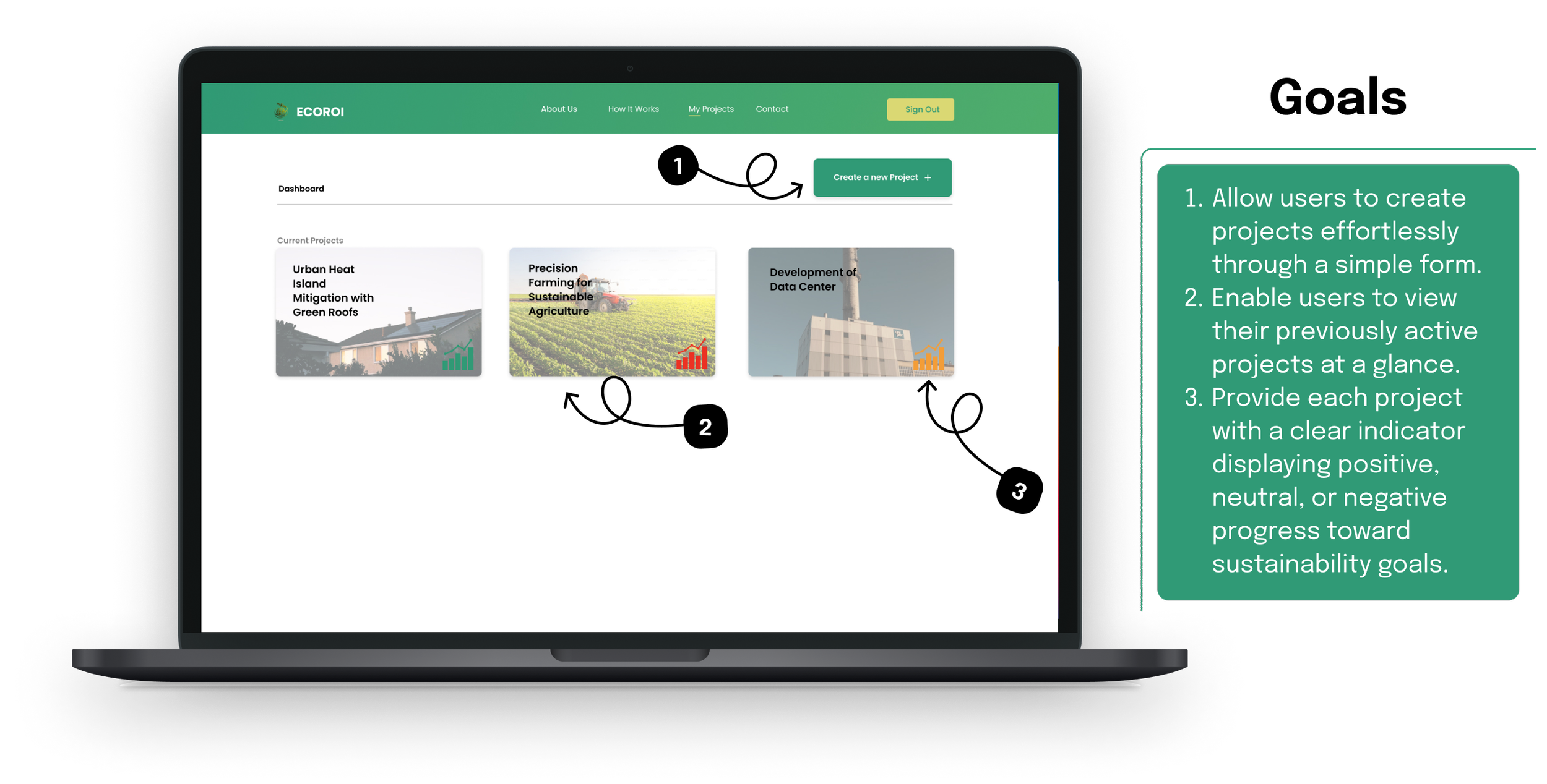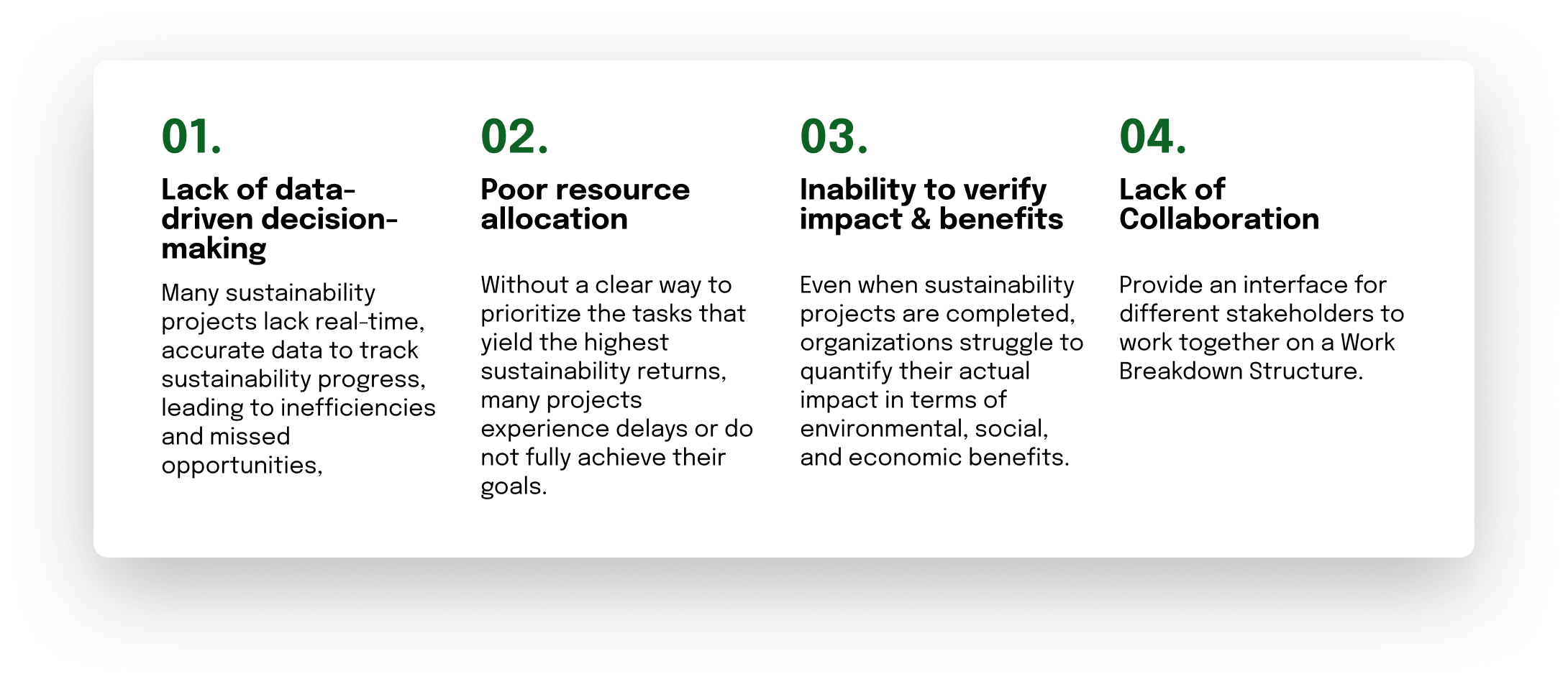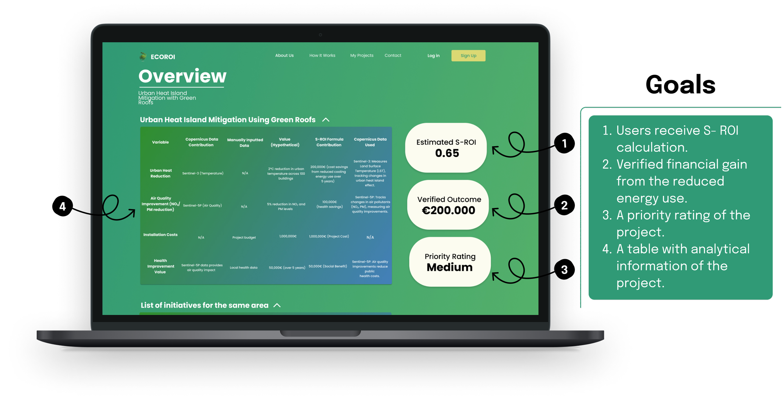 Our MVP enables users to input project sustainability specifications and targets, cross-check and validate this information using satellite data, and calculate the Sustainability Return on Investment (S-ROI).