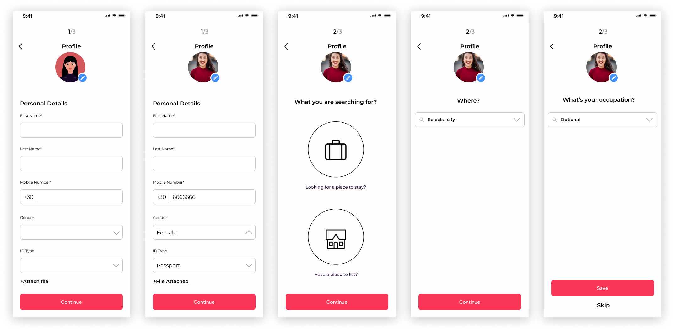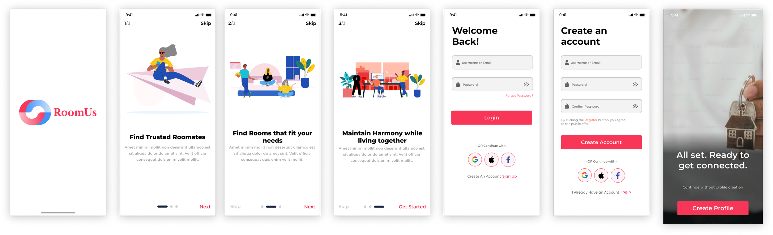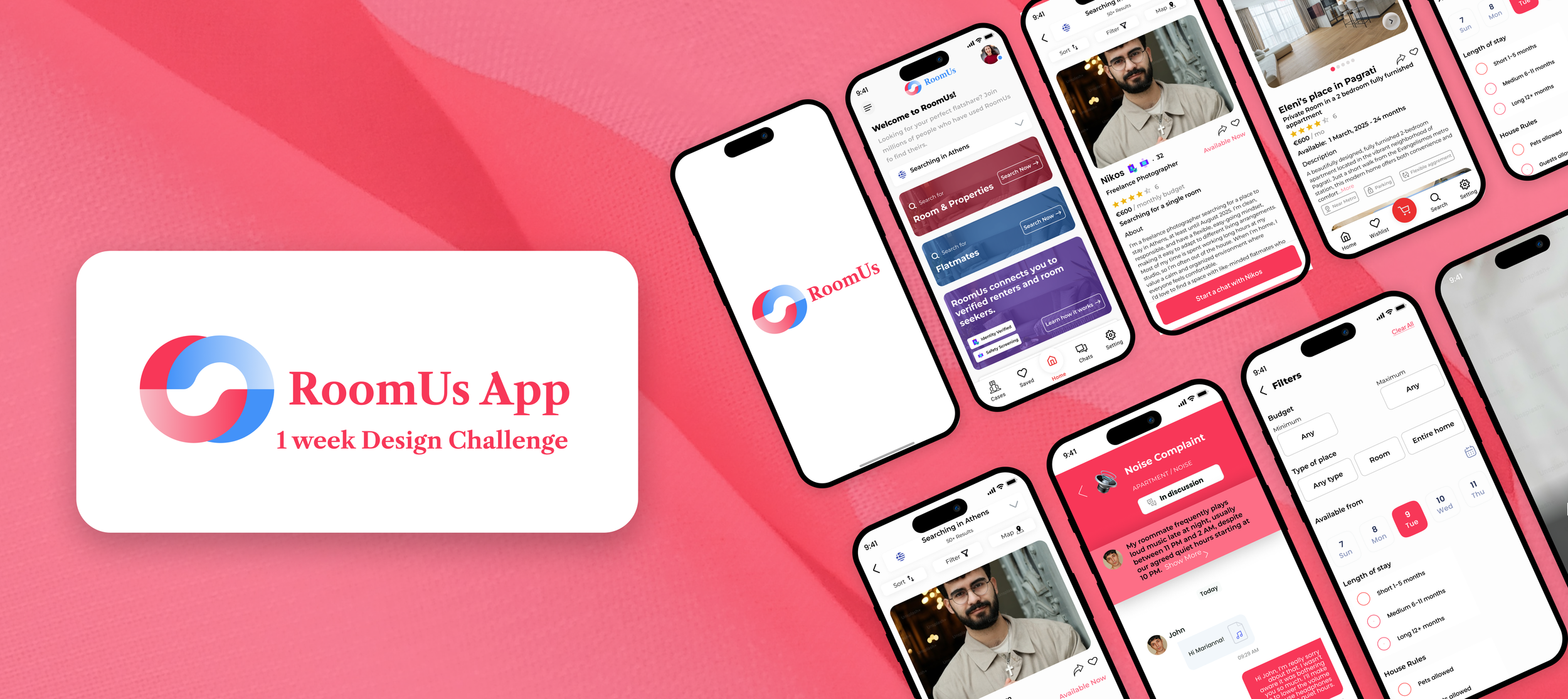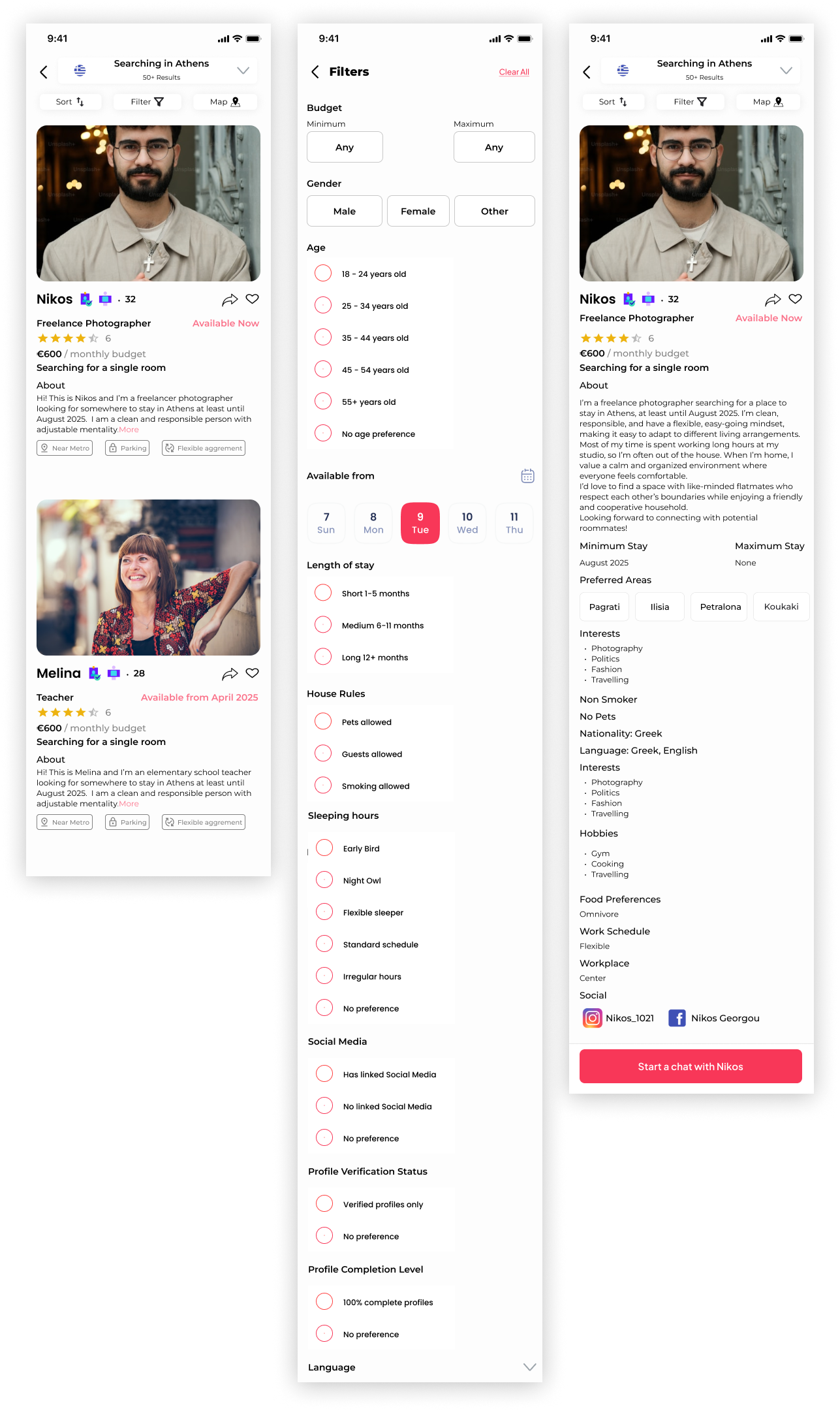 I explored the internet and the App Store, searching for existing solutions that could inspire me. I benchmarked three apps: Roomster, Roomi, and SpareRoom, as many others were unavailable in Greece. From these, I gathered ideas and user flows, and the core concept of the app began to take shape in my mind.